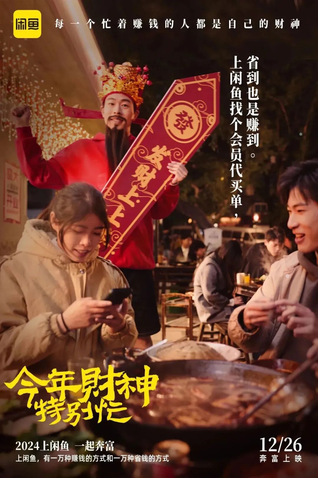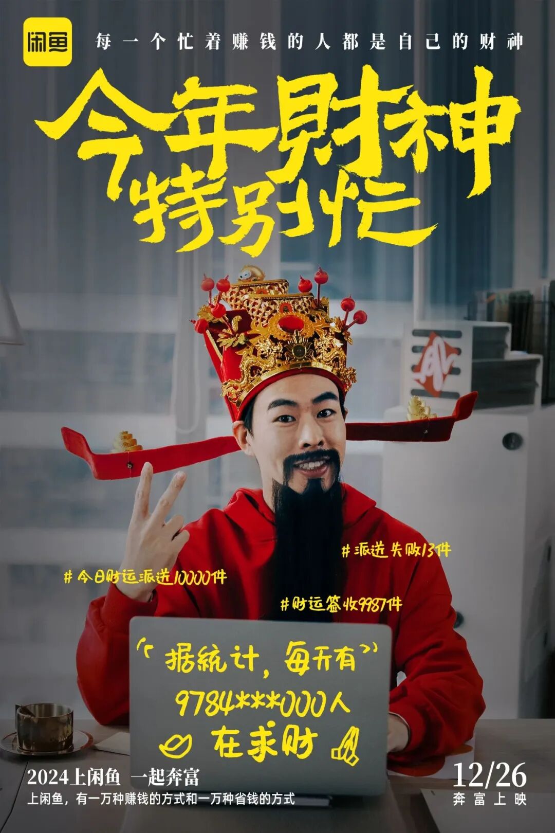 在年末“辞旧迎新”之际,我们帮闲鱼将这一有趣的设定拍了出来,以财神的视角,一个年度最忙的人、天庭打工人形象的财神,见证众生是如何求财得财,生财有道,实现人生奔富的。