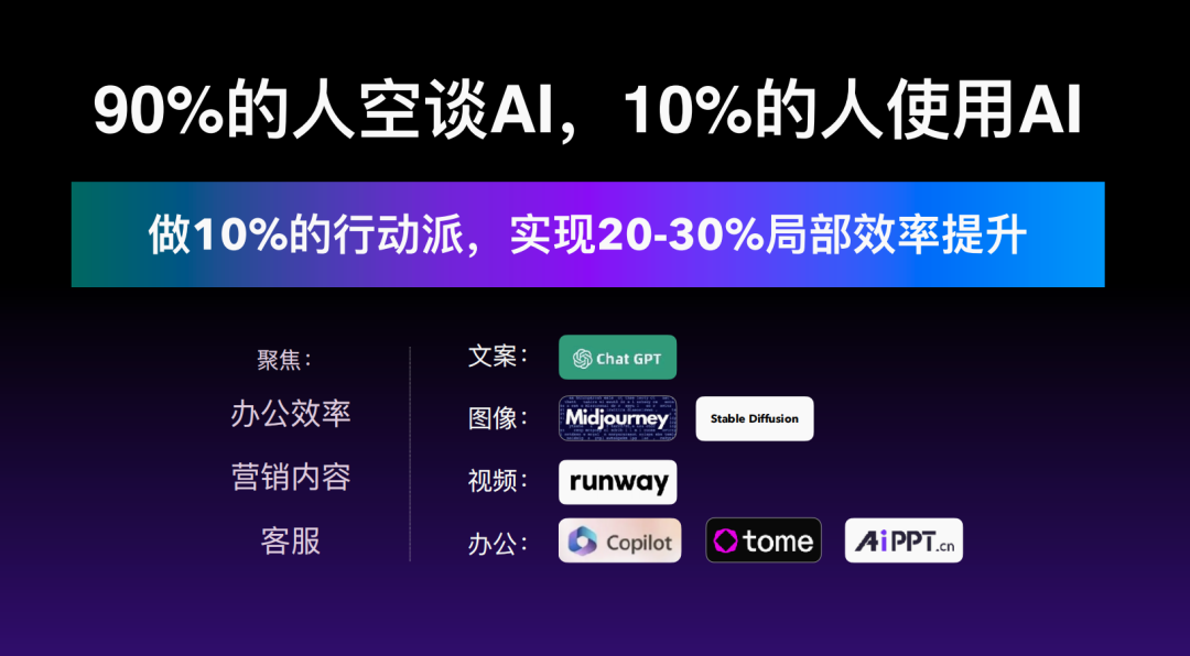 所以,赵充发现:90%的⼈空谈AI,10%的⼈使⽤AI。